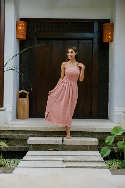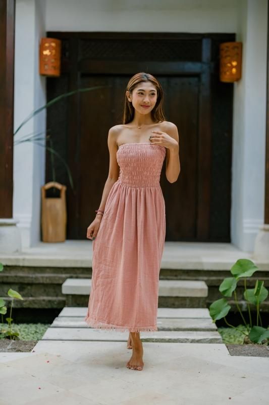 ビーチやトリップの時に大活躍すること間違いなしのシャーリングベアトップドレス。パット入りなのでこれ1枚で着用できて着替えも楽々。シャーリング部分はホールド力はあるけれど締め付けるような窮屈さはなく快適に着ていただけます。着心地良く、着替えも楽だけど、フリンジやサイドスリットを入れて女性らしい魅力的なデザインにもこだわりました。カラーはバニラ、フラミンゴ、ビスケット、ウォータグリーンの4色。サイズフリー。